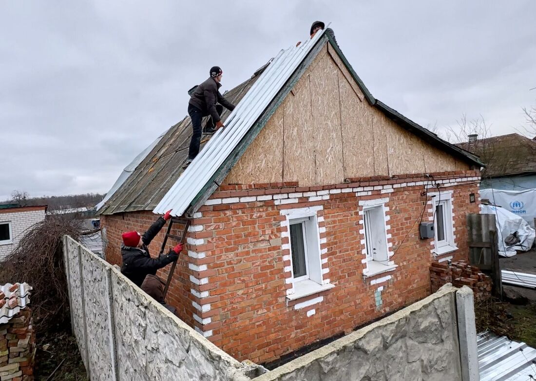 Pokračující bombardování ničí domy a byty. Místní týmy vyjíždějí přímo k poškozeným domům a provádějí nouzové opravy střech, aby rodiny mohly v domech dál žít. Pro mnoho z nich jednoduše neexistuje žádná jiná možnost.